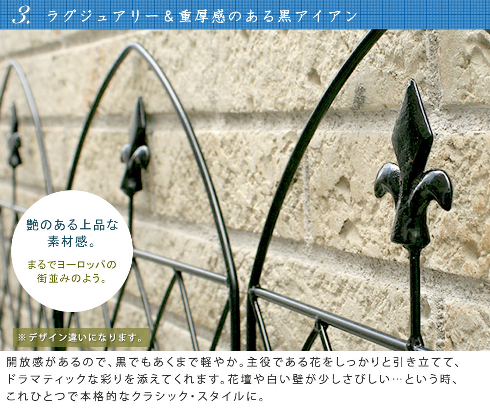どんなお庭にも似合う、シンプルな中にエレガンスが薫るアイアンフェンス。