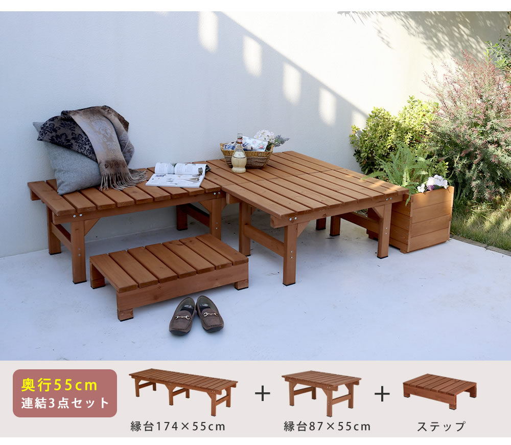| ■サイズ(約) | デッキ縁台(幅174):幅1740×奥行550×高さ400mm デッキ縁台(幅87):幅870×奥行550×高さ400mm ステップ:幅650×奥行395×高さ160mm |