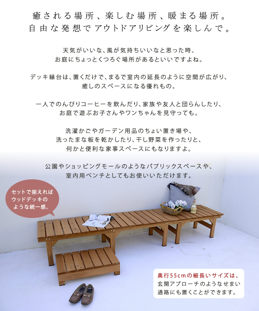 デッキ縁台は、置くだけで、まるで室内の延長のように空間が広がり、癒しのスペースになる優れもの。