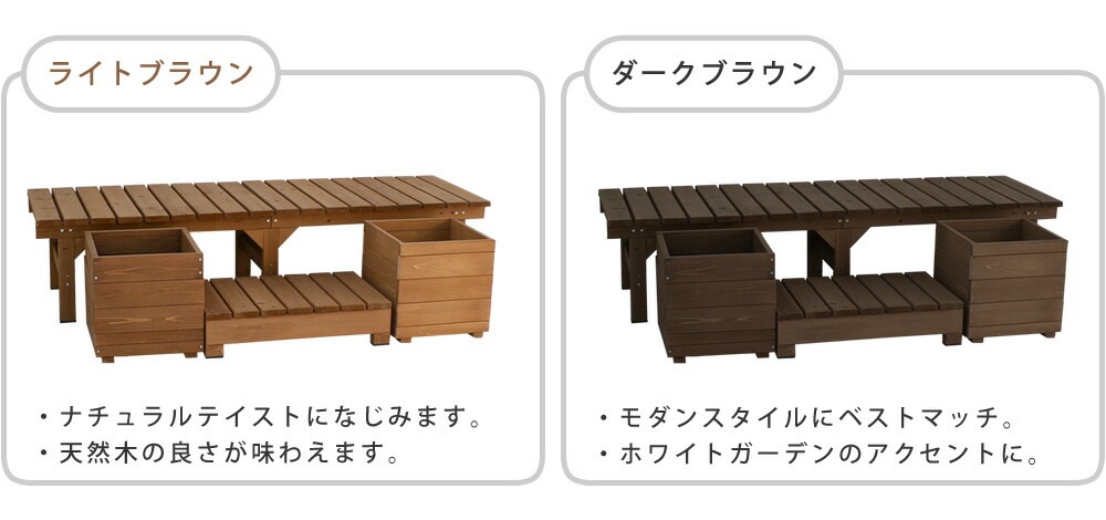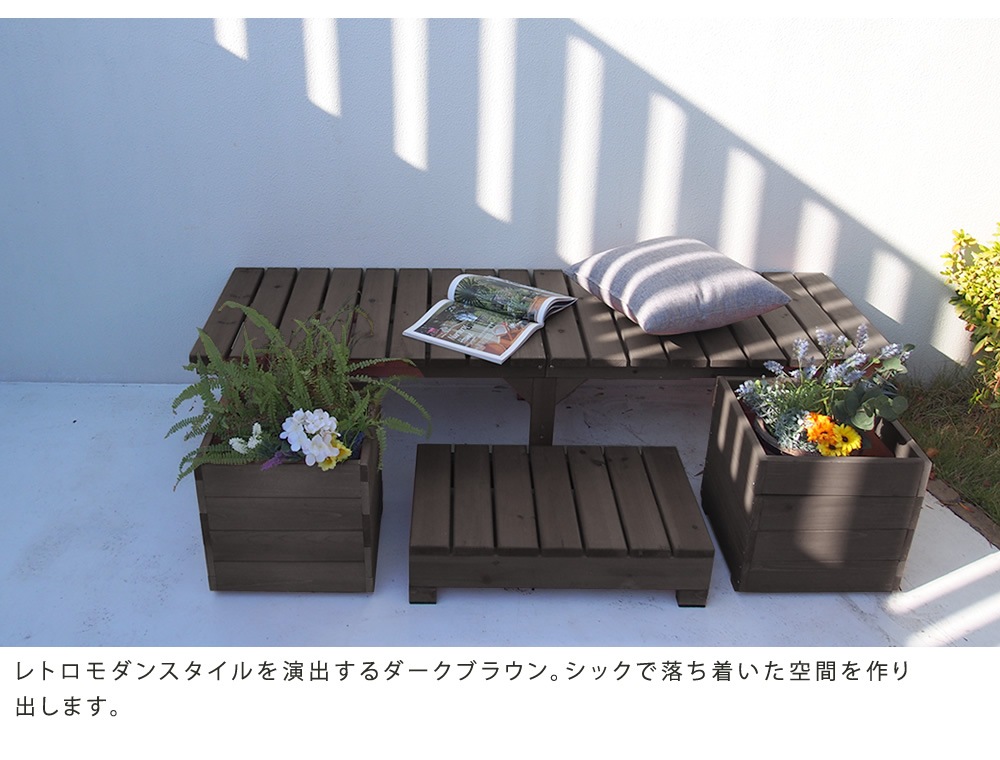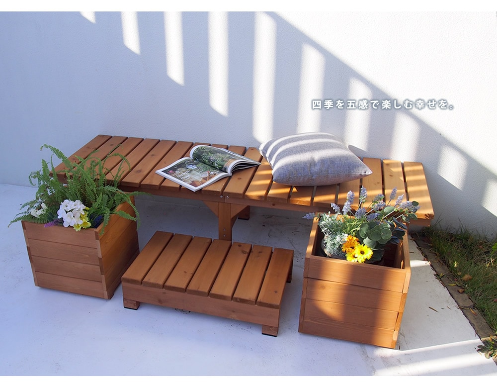 | ■サイズ(約) | デッキ縁台:幅1740×奥行550×高さ400mm ステップ:幅650×奥行395×高さ160mm プランター:幅360×奥行360×高さ360mm |
