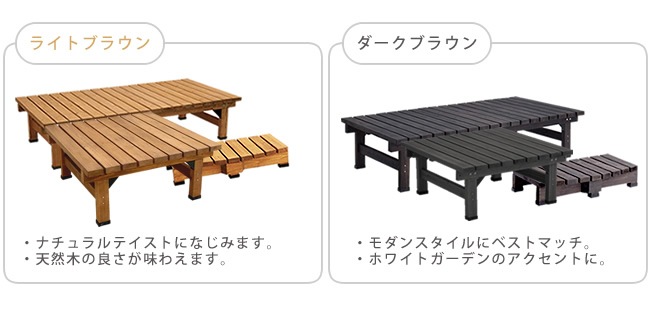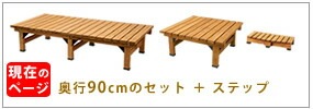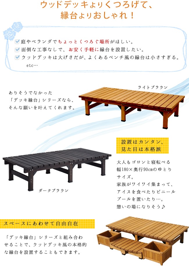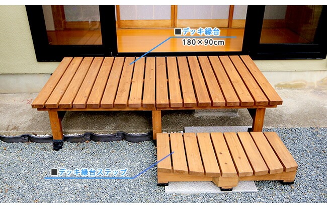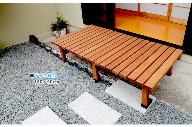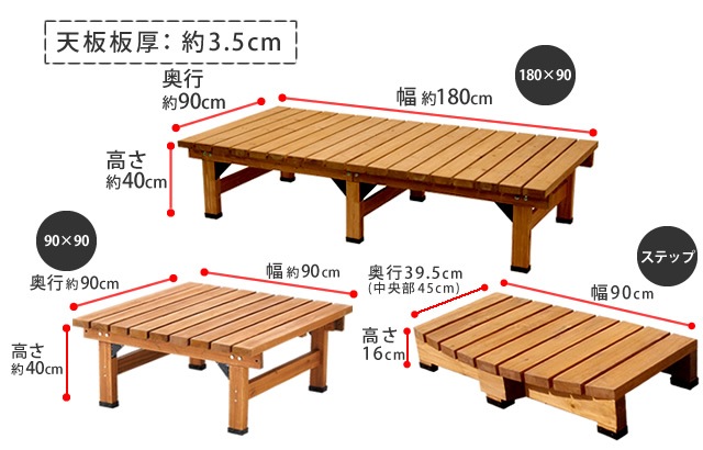 | ■サイズ | デッキ縁台(幅180):幅約1800×奥行約900×高さ約400mm デッキ縁台(幅90):幅約900×奥行約900×高さ約400mm ステップ:幅約900×奥行約395(中央部約450)×高さ約160mm |