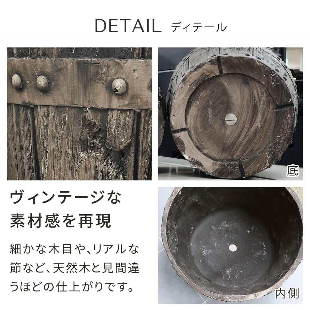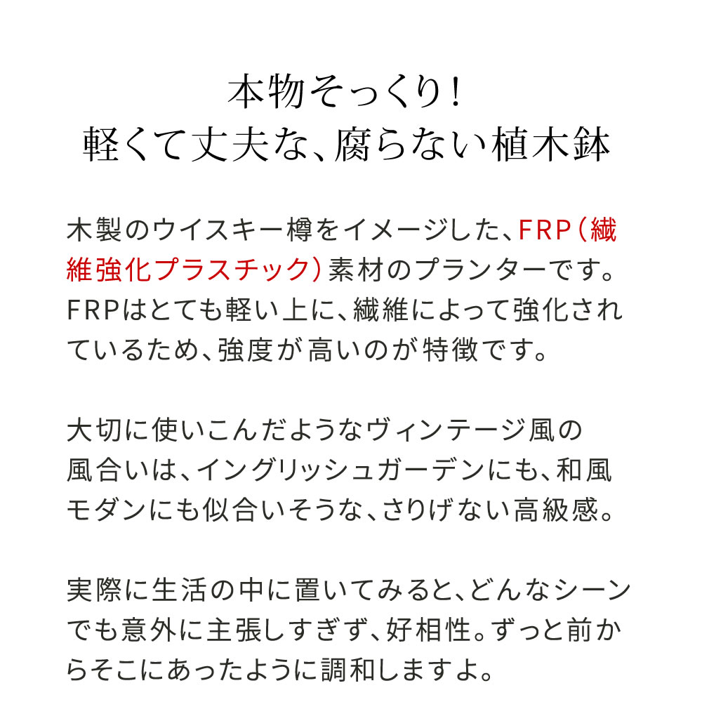 木製のウイスキー樽をイメージした、FRP(繊維強化プラスチック)素材のプランターです。
