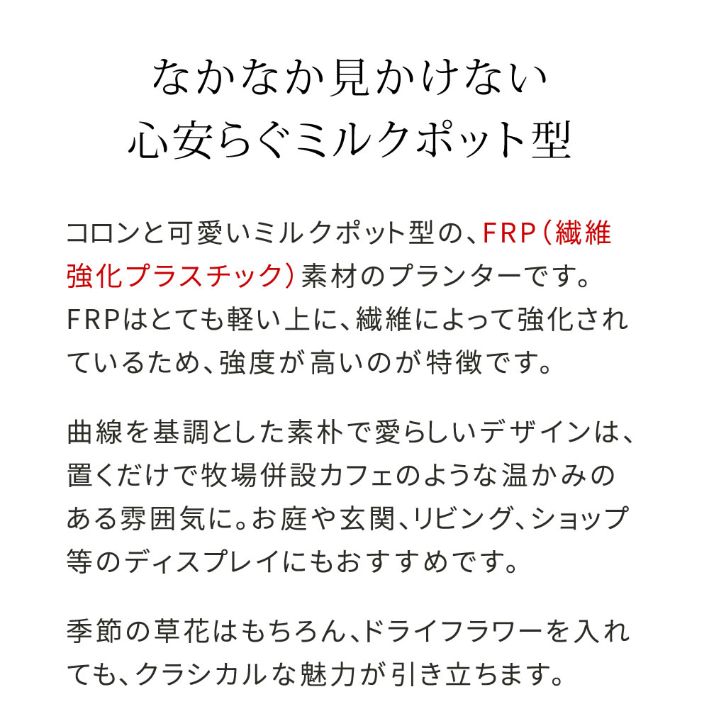 コロンと可愛いミルクポット型の、FRP(繊維強化プラスチック)素材のプランターです。